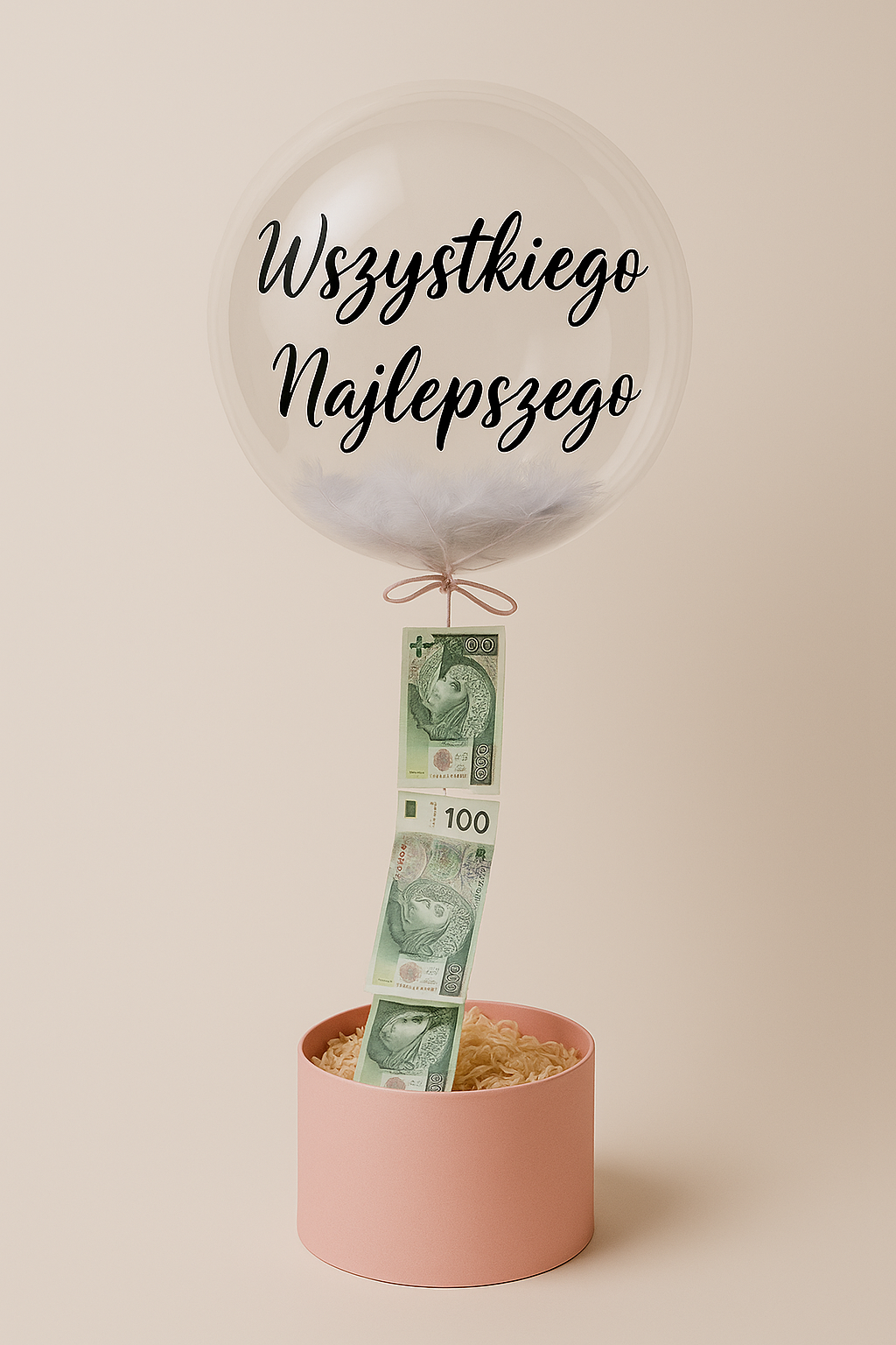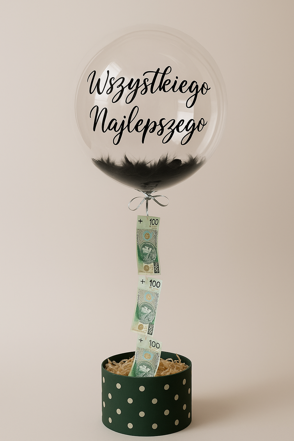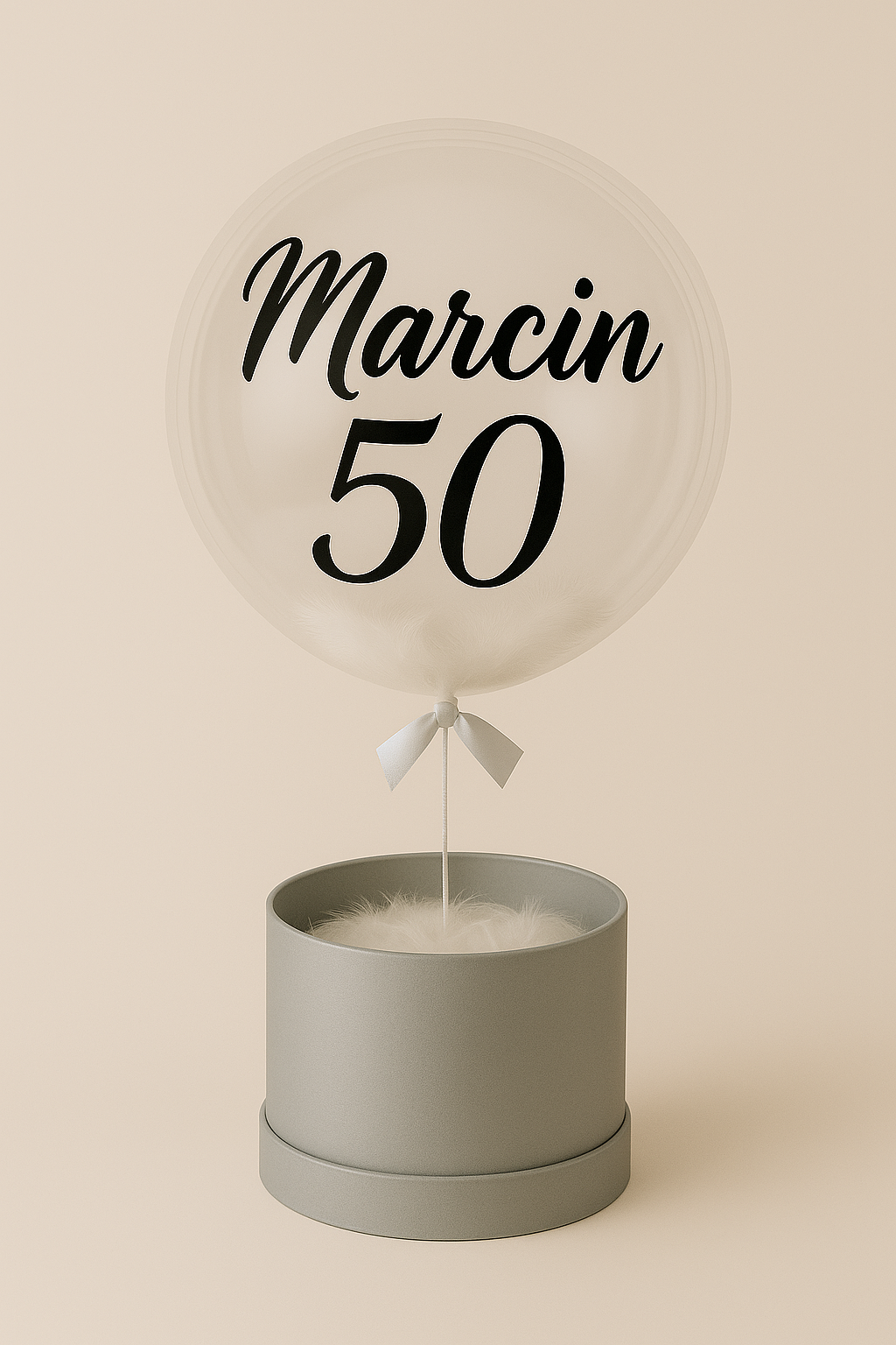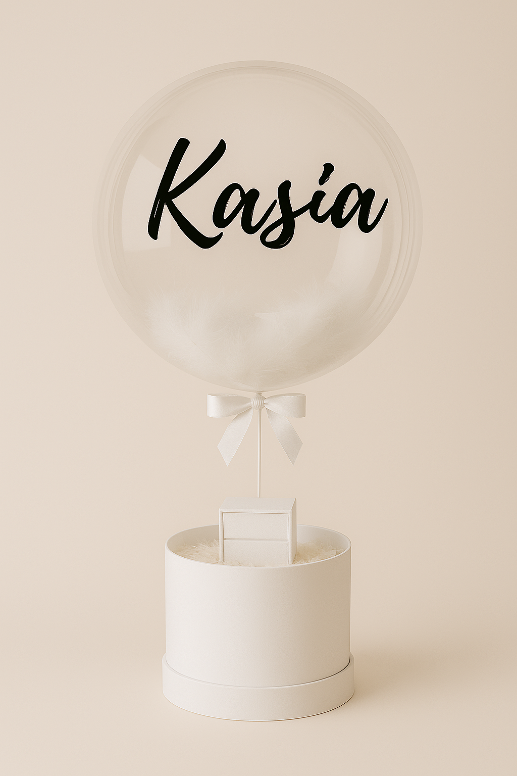 Eleganckie pudełko z personalizowanym balonem, pod którym ukryta jest niespodzianka. Po rozwiązaniu wstążki balon unosi się delikatnie w górę, a jego zawartość zostaje efektownie ujawniona, tworząc niezapomniany moment zaskoczenia.