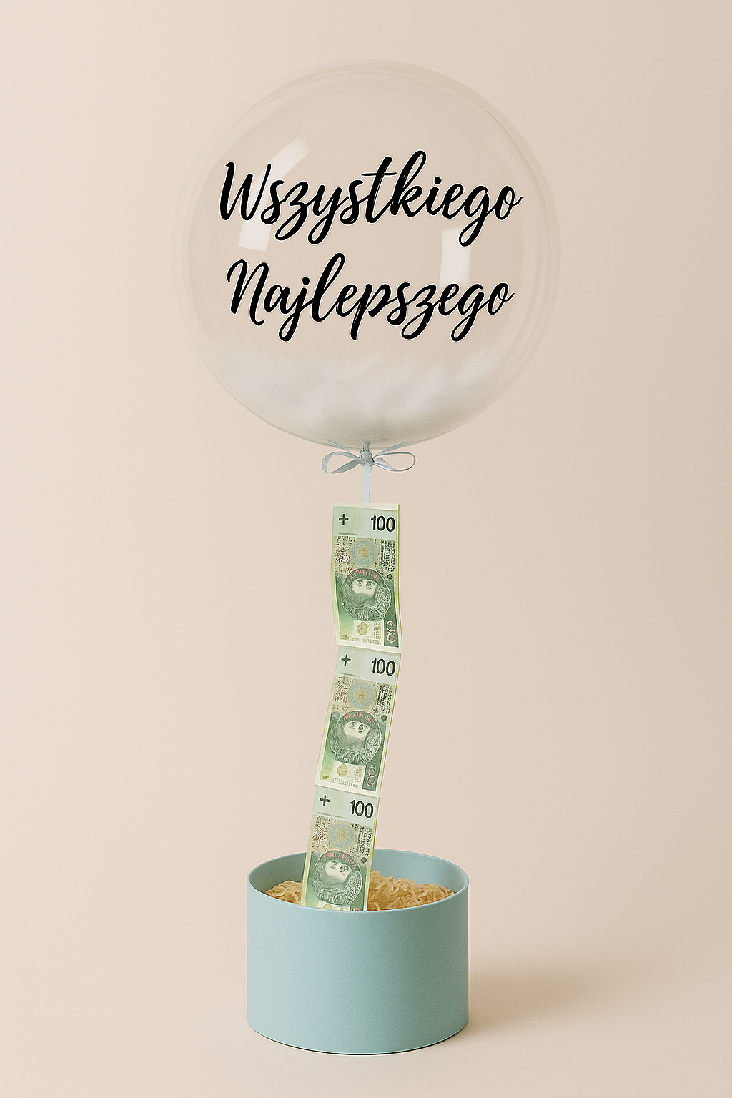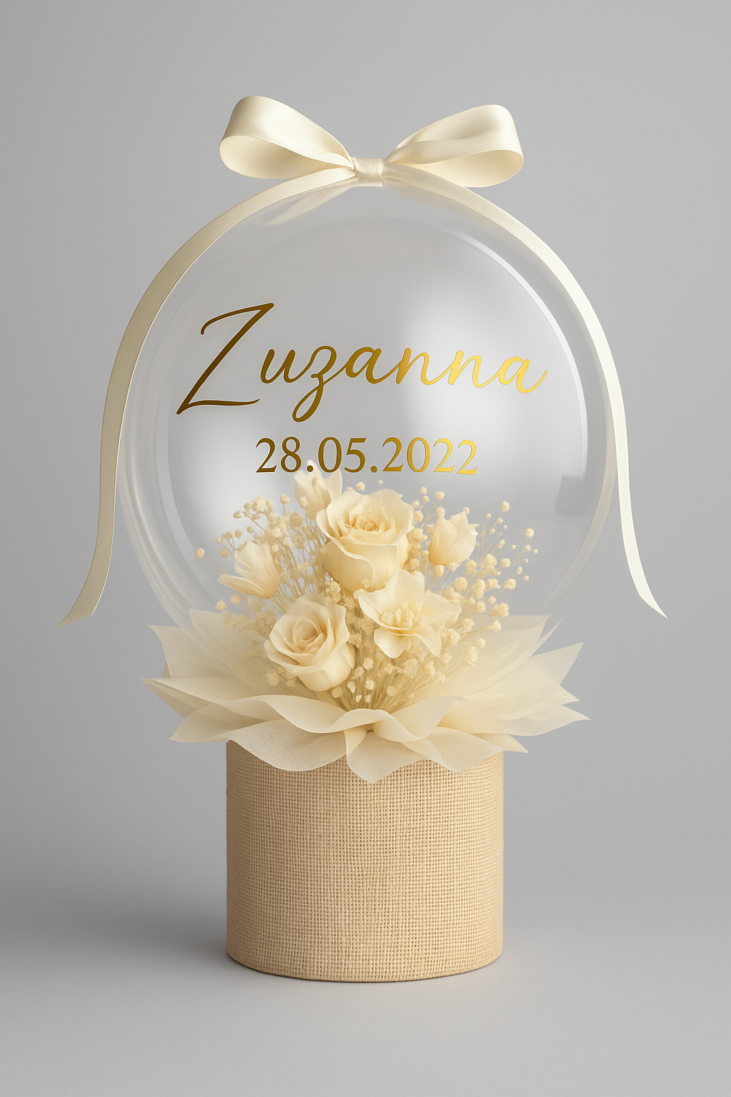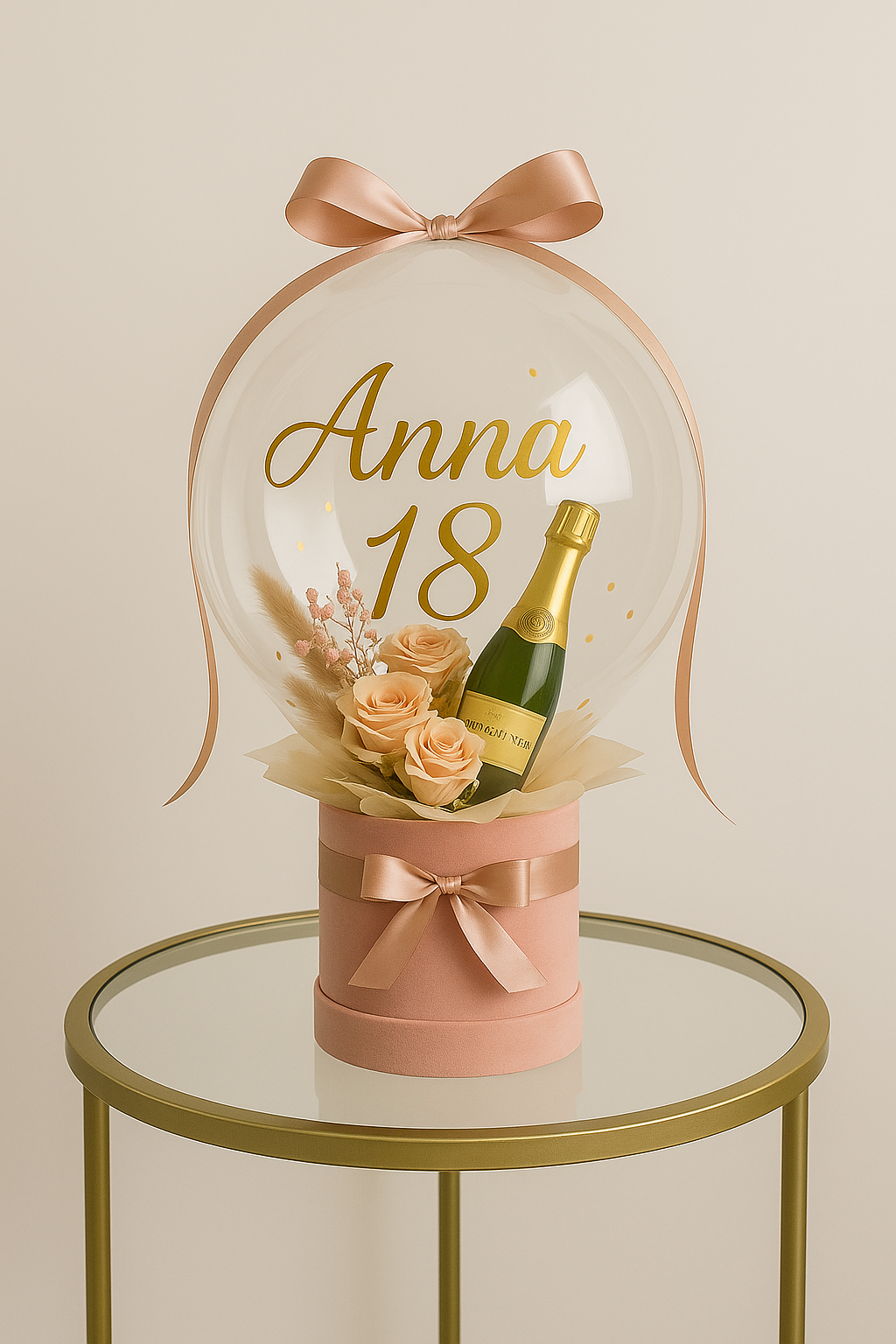 Eleganckie pudełko z personalizowanym balonem, pod którym ukryta jest niespodzianka. Po rozwiązaniu wstążki balon unosi się delikatnie w górę, a jego zawartość zostaje efektownie ujawniona, tworząc niezapomniany moment zaskoczenia.