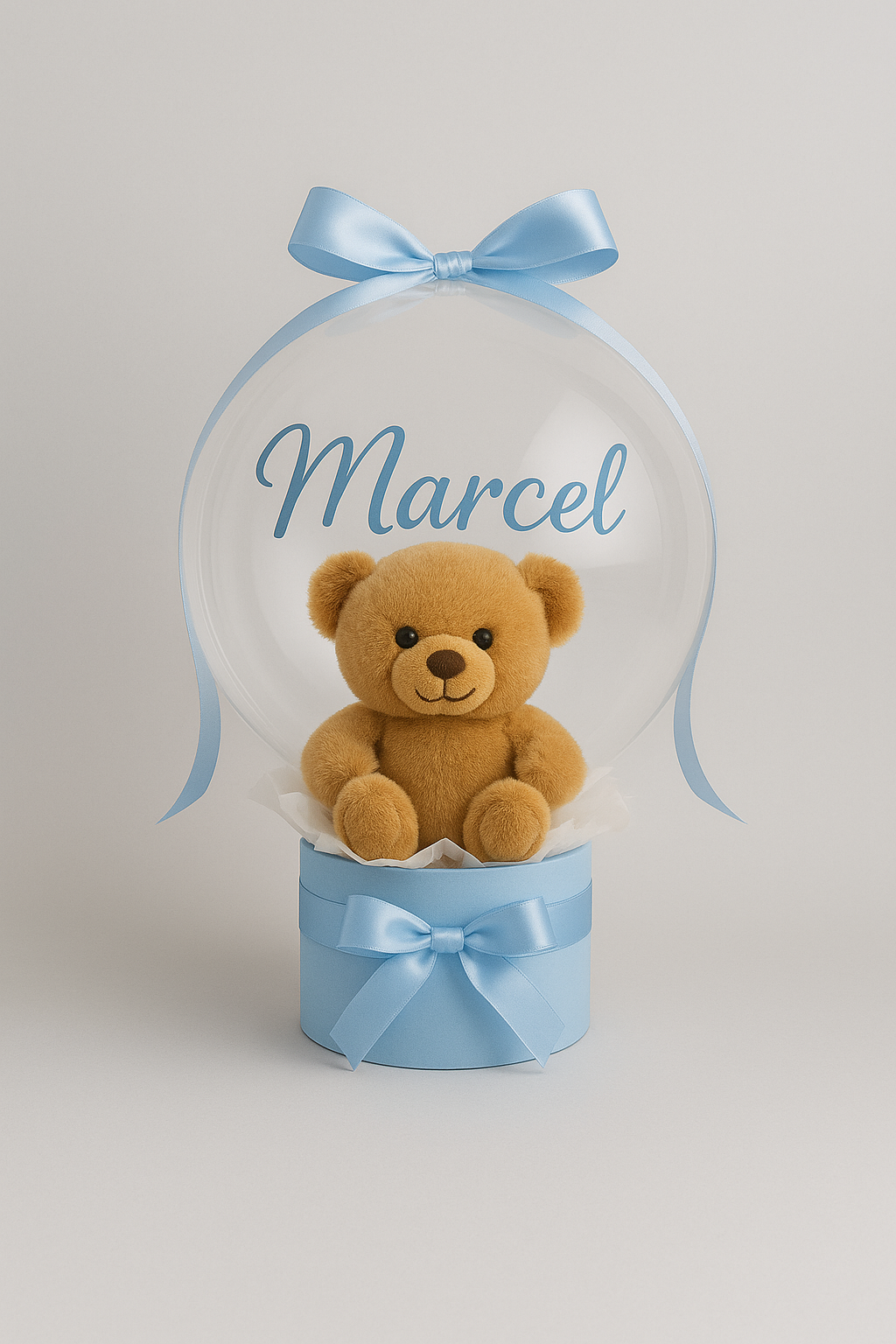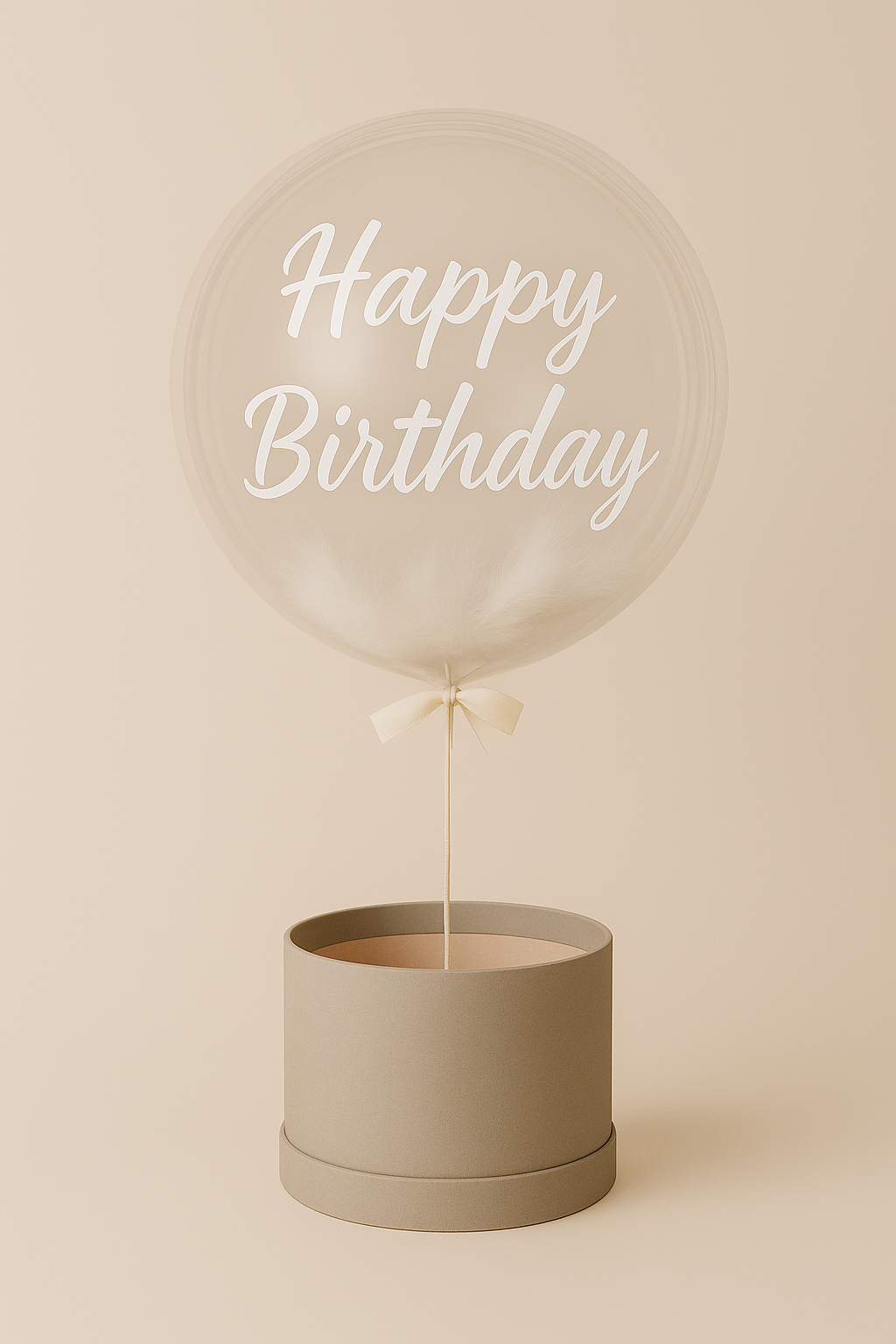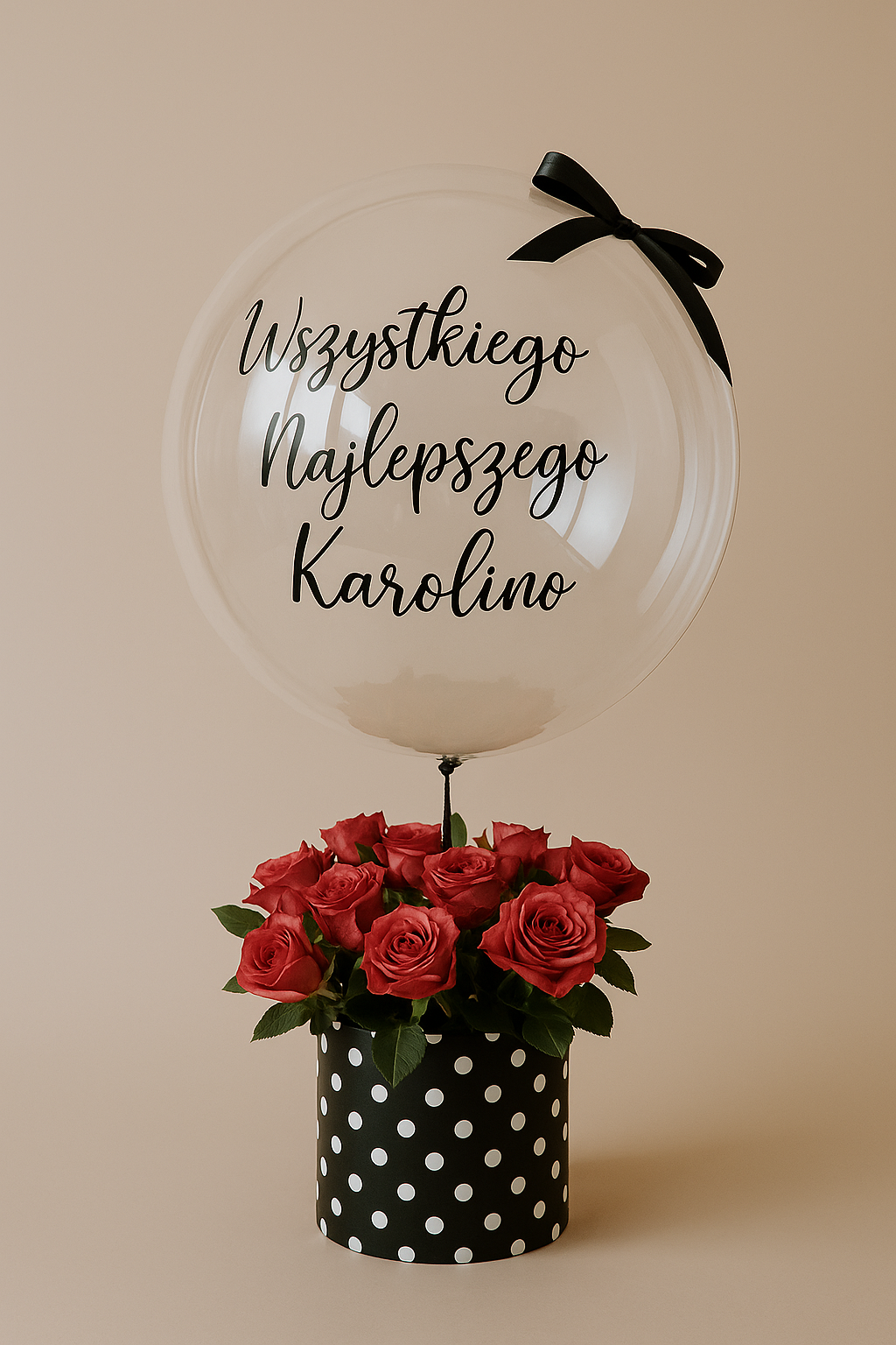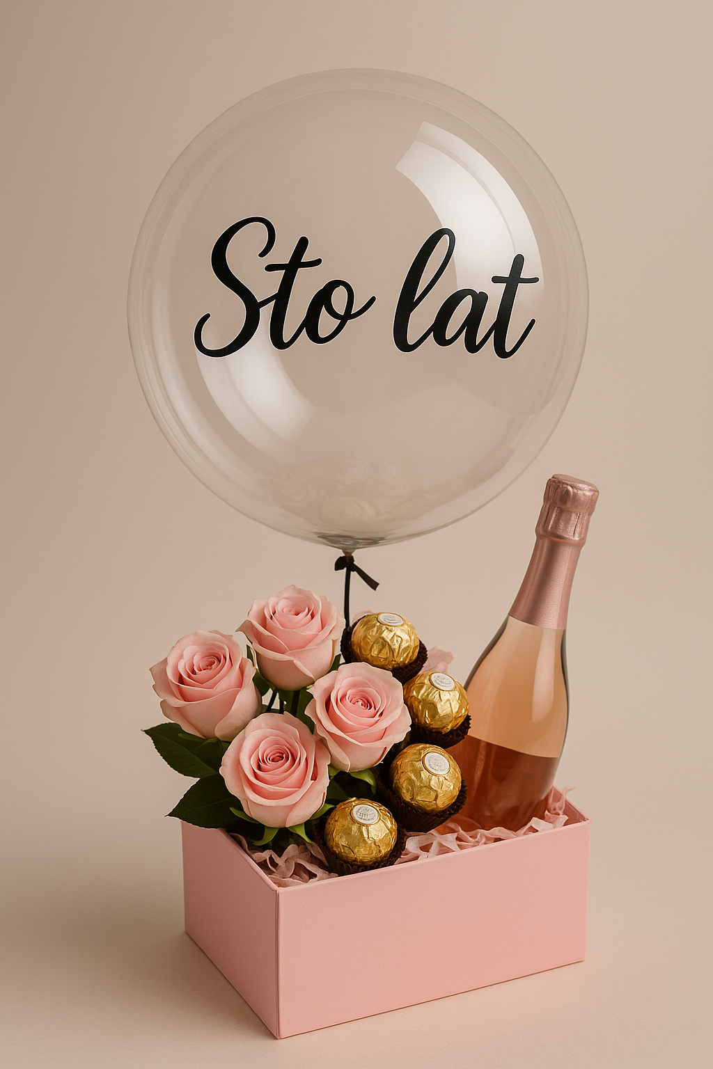 Eleganckie pudełko z personalizowanym balonem, pod którym ukryta jest niespodzianka. Po rozwiązaniu wstążki balon unosi się delikatnie w górę, a jego zawartość zostaje efektownie ujawniona, tworząc niezapomniany moment zaskoczenia.