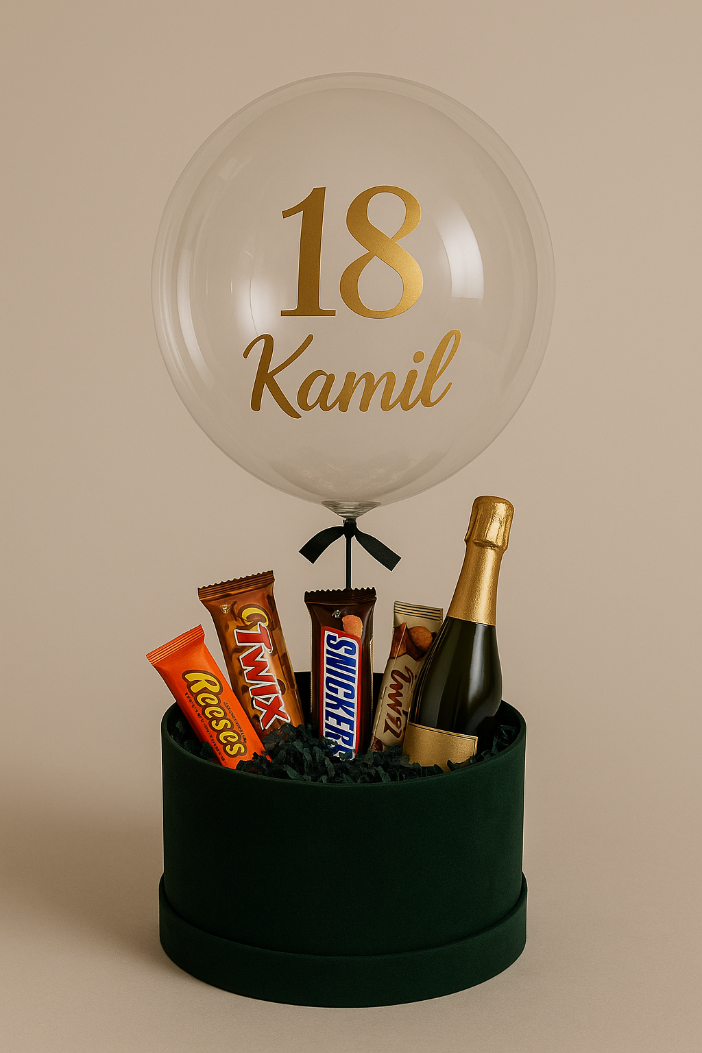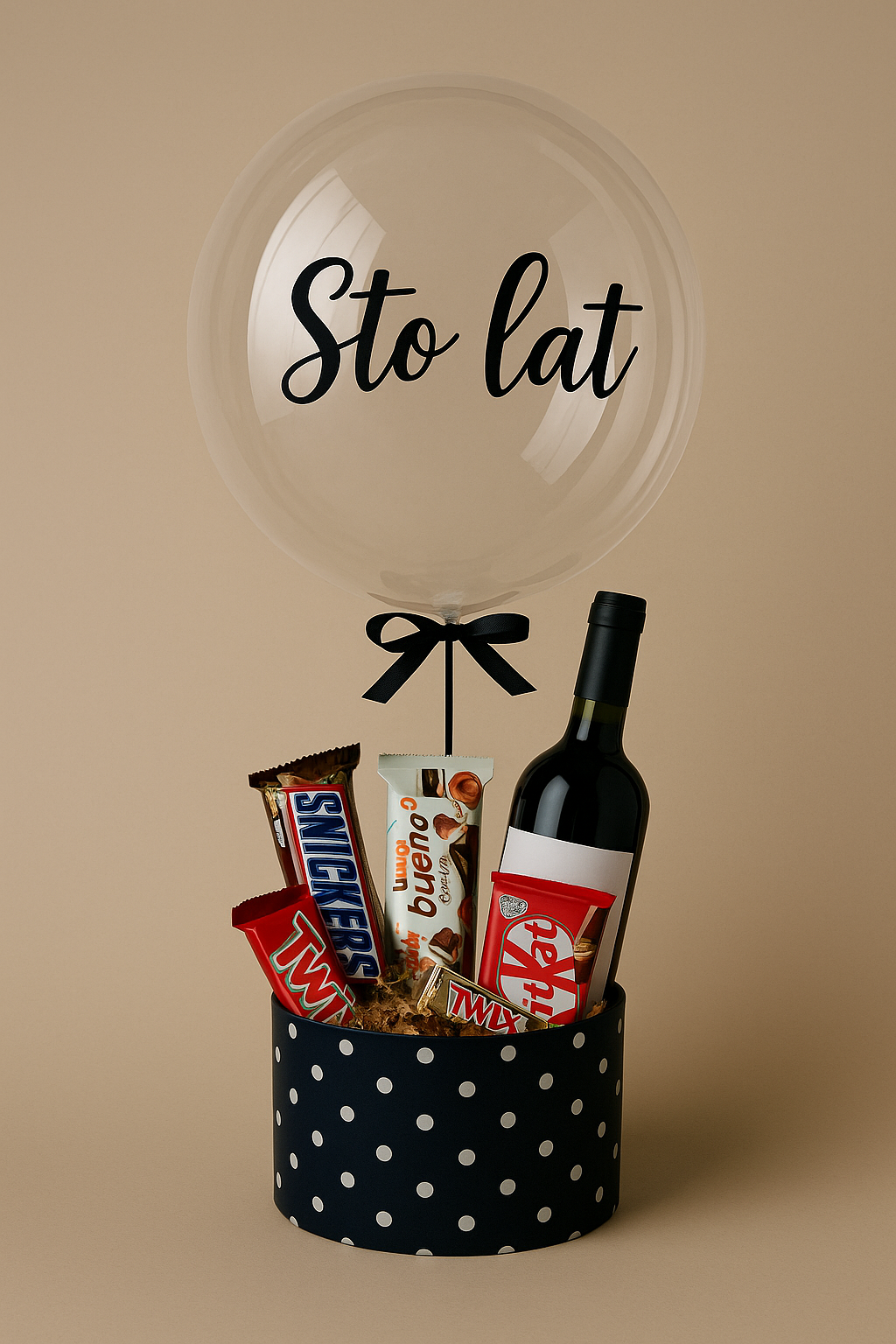 Eleganckie pudełko wypełnione po brzegi ulubionymi słodyczami i dodatkami, które wywołają uśmiech na twarzy obdarowanego. Do zestawu dołączamy personalizowany balon na patyczku, który dopełnia całą kompozycję i nadaje prezentowi wyjątkowego charakteru.